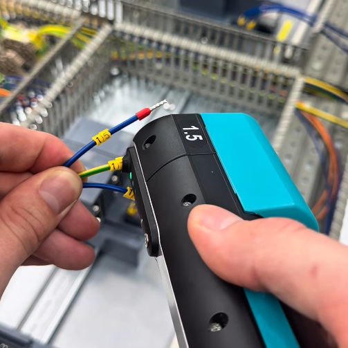 Mobile handheld battery-powered device for processing 1.5 mm² tape ferrules with functional end. Designed for PVC insulated conductors – perfect for repair work and field use.